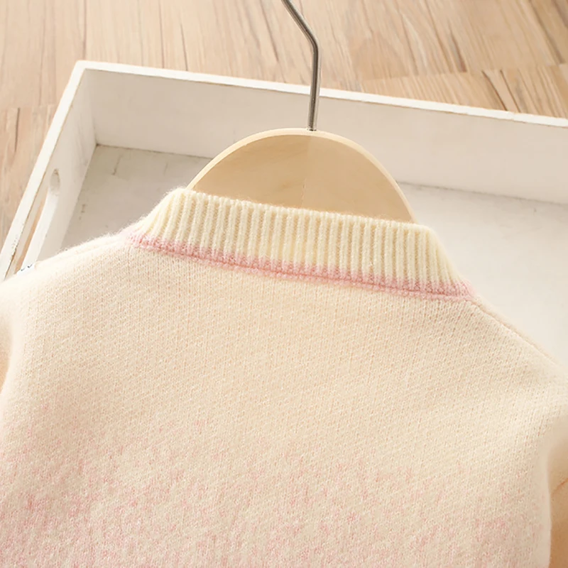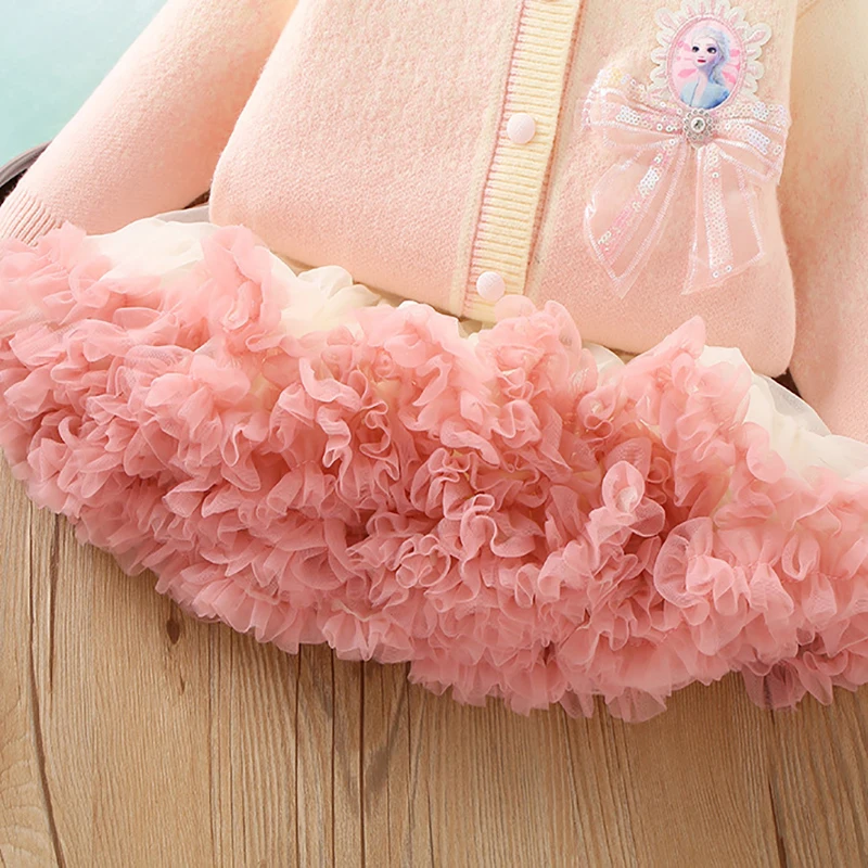 柔らかなニットカーディガンは暖かく心地よい着心地で、淡いカラーが上品な雰囲気を引き立てます。ふんわり重なったチュールスカートは、まるで雪の結晶が舞うように軽やかに広がり、小さなプリンセスの可憐さを一層輝かせます。