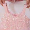 きらめくスパンコールのビスチェが目を引く、気品あふれるプリンセスドレス。柔らかなピンクカラーが可憐さを引き立て、光の角度によって上品に輝きます。
